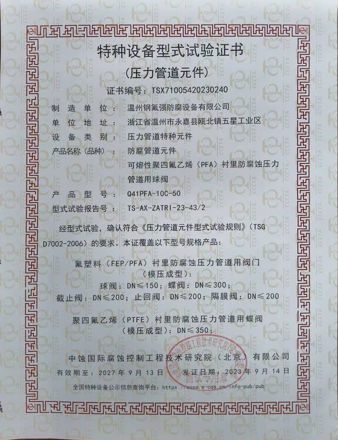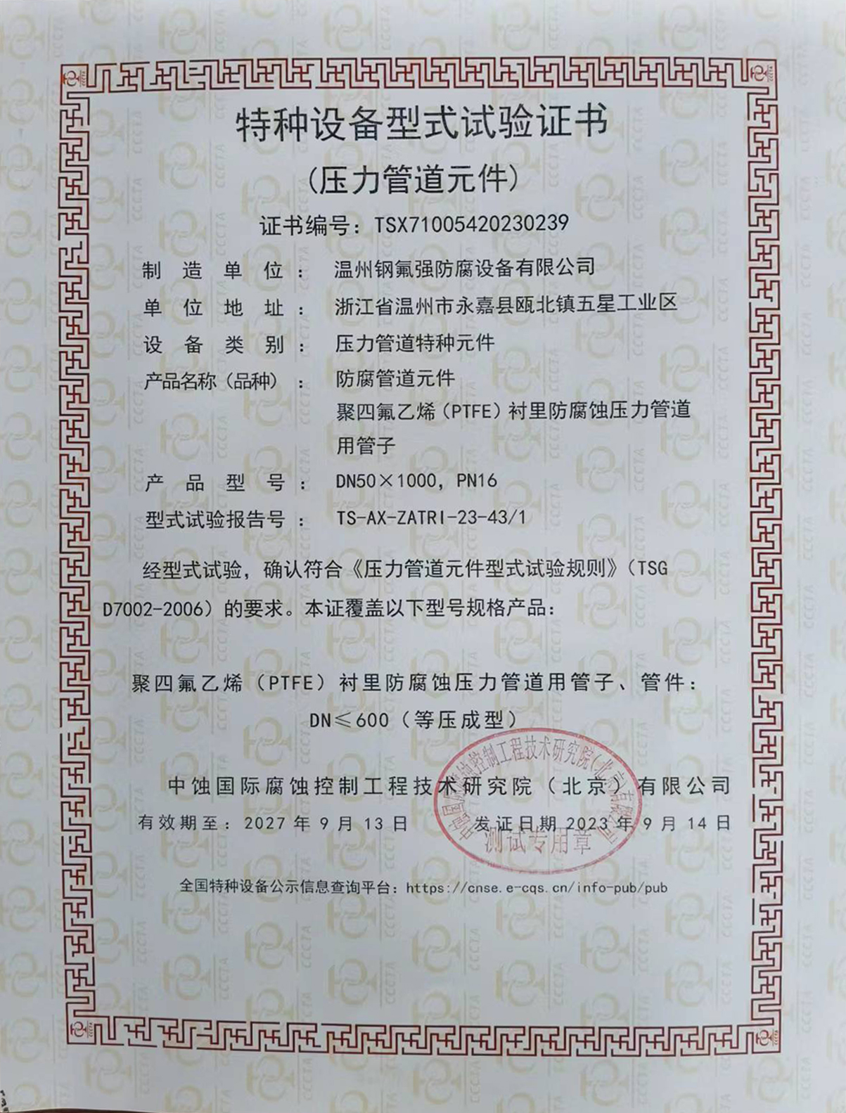 特種設備型式試驗證書(壓力管道元件) |